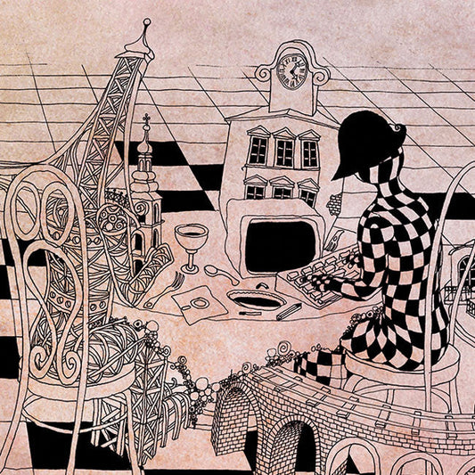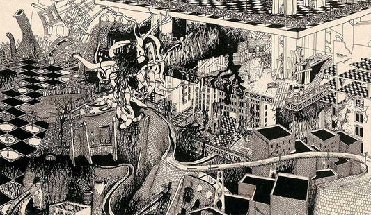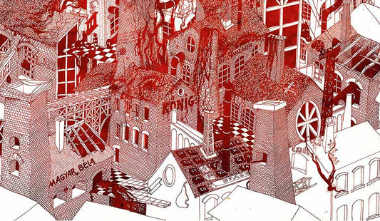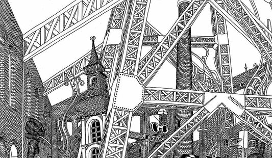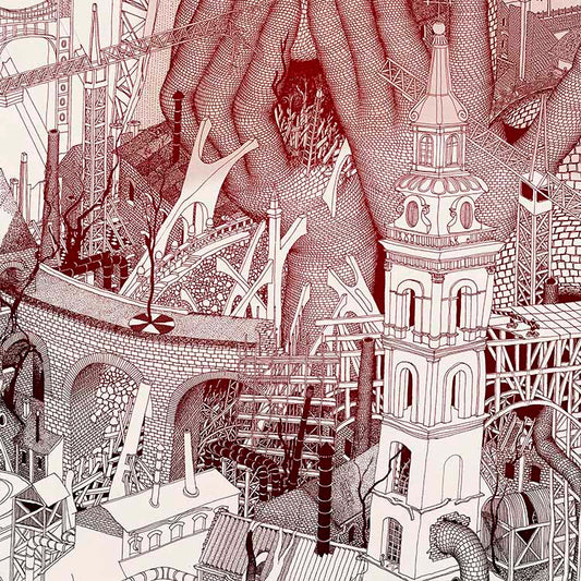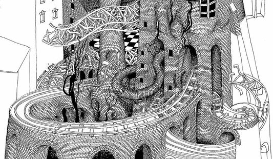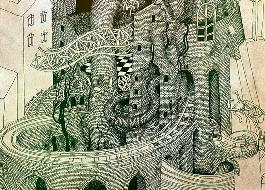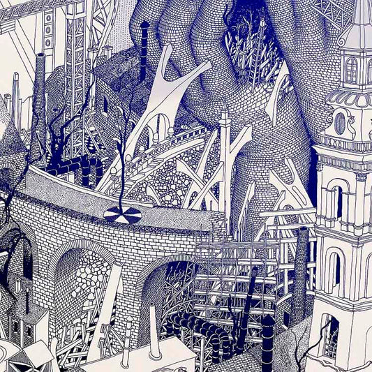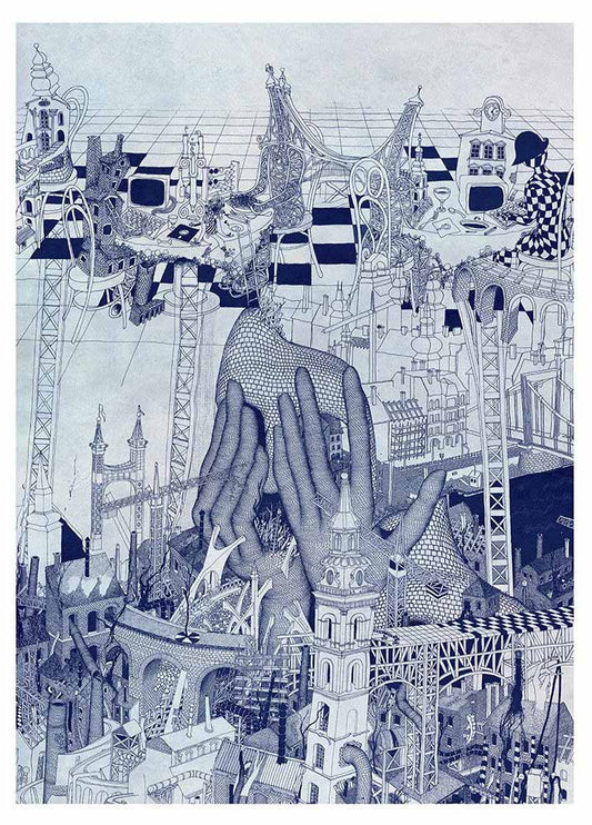 Primarily, black and white pen and ink illustrations are drawn with rapidograph, inspired by the images of the films of Andrei Tarkovsky (e.g., Stalker), the buildings of Antoni Gaudí, and the absurd thoughts of Luis Bunuel. Surrealistic fantasy cityscapes with rampant pipelines, chimneys growing like trees, dangerous bridges, crumbling, decaying industrial buildings, people made from brick and construction steel – eating digital letter pasta…