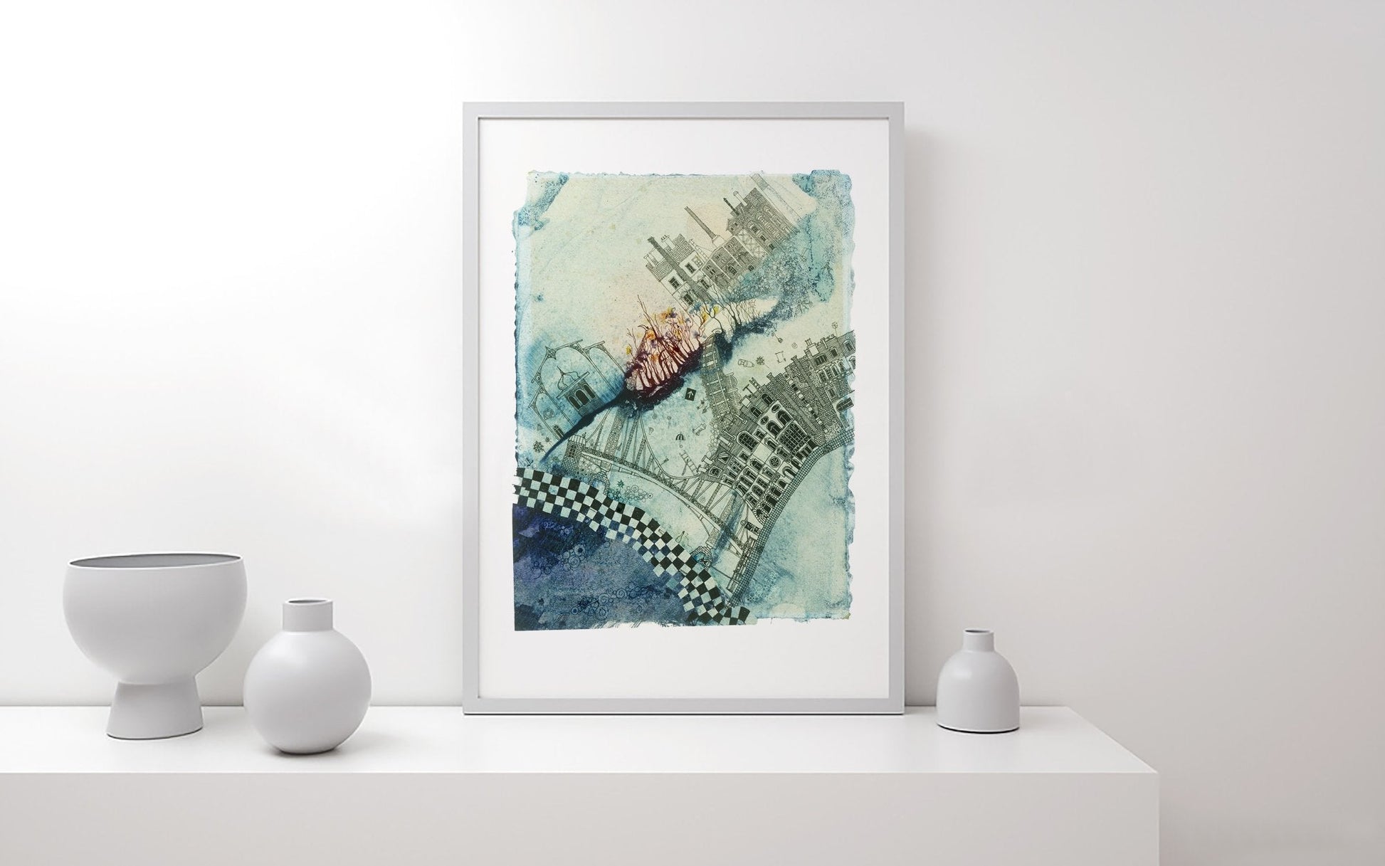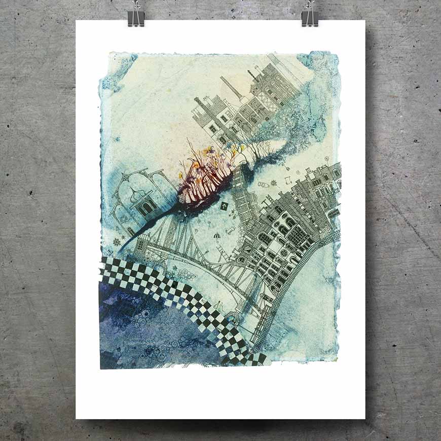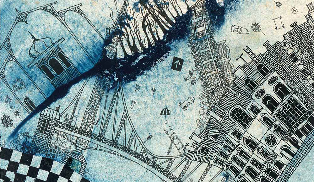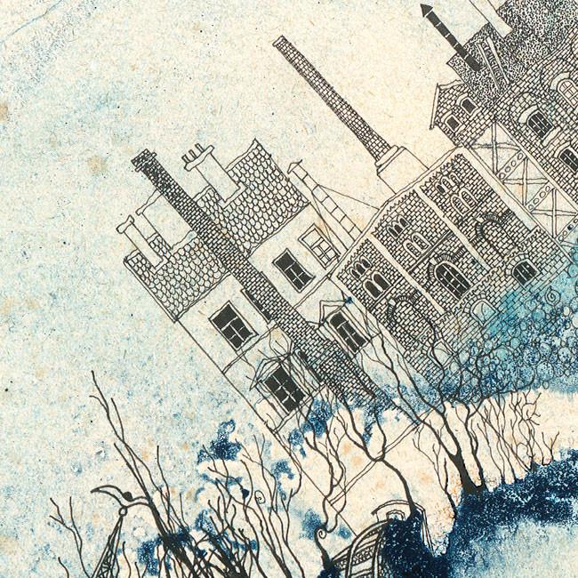 I poured blue watercolor and black ink mixture on the paper, then I swirled, shook the paper. When the watercolor dried, I jumped into this blue land and built my own black and white city - a twisted Budapest in the twilight.