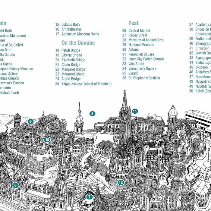 The Perspective Map of Budapest has many things for you to discover and to marvel about for hours, weeks, or even months. It draws up questions in the viewer, raises interest, and arouses the desire to check out all the actions depicted in the picture.