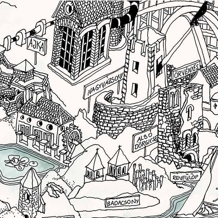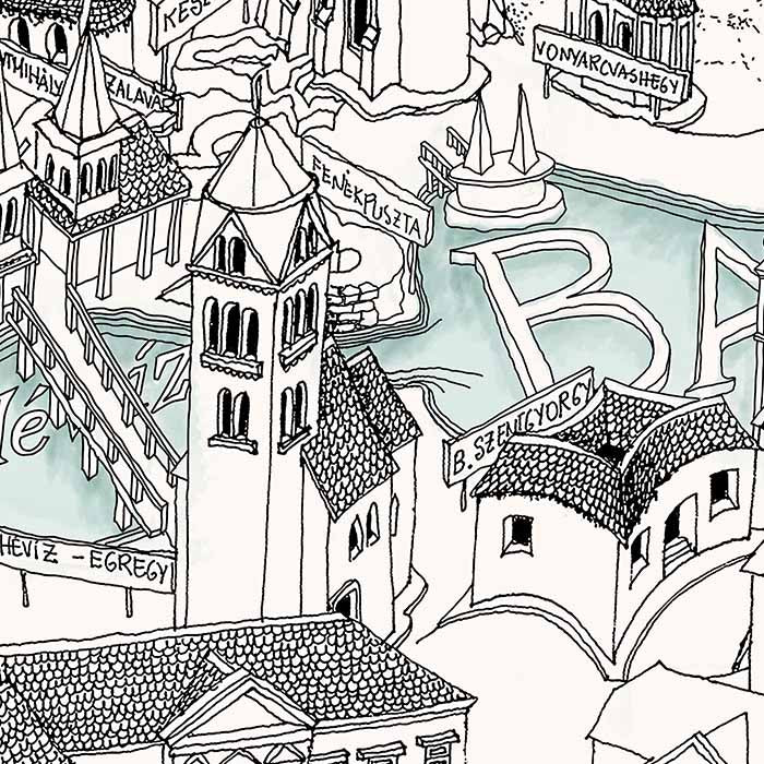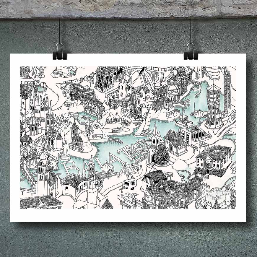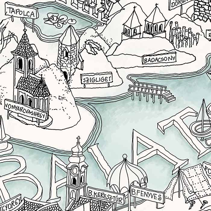 Very detailed freehand pen and ink Bird's Eye View Map of the Lake Balaton (Hungary).