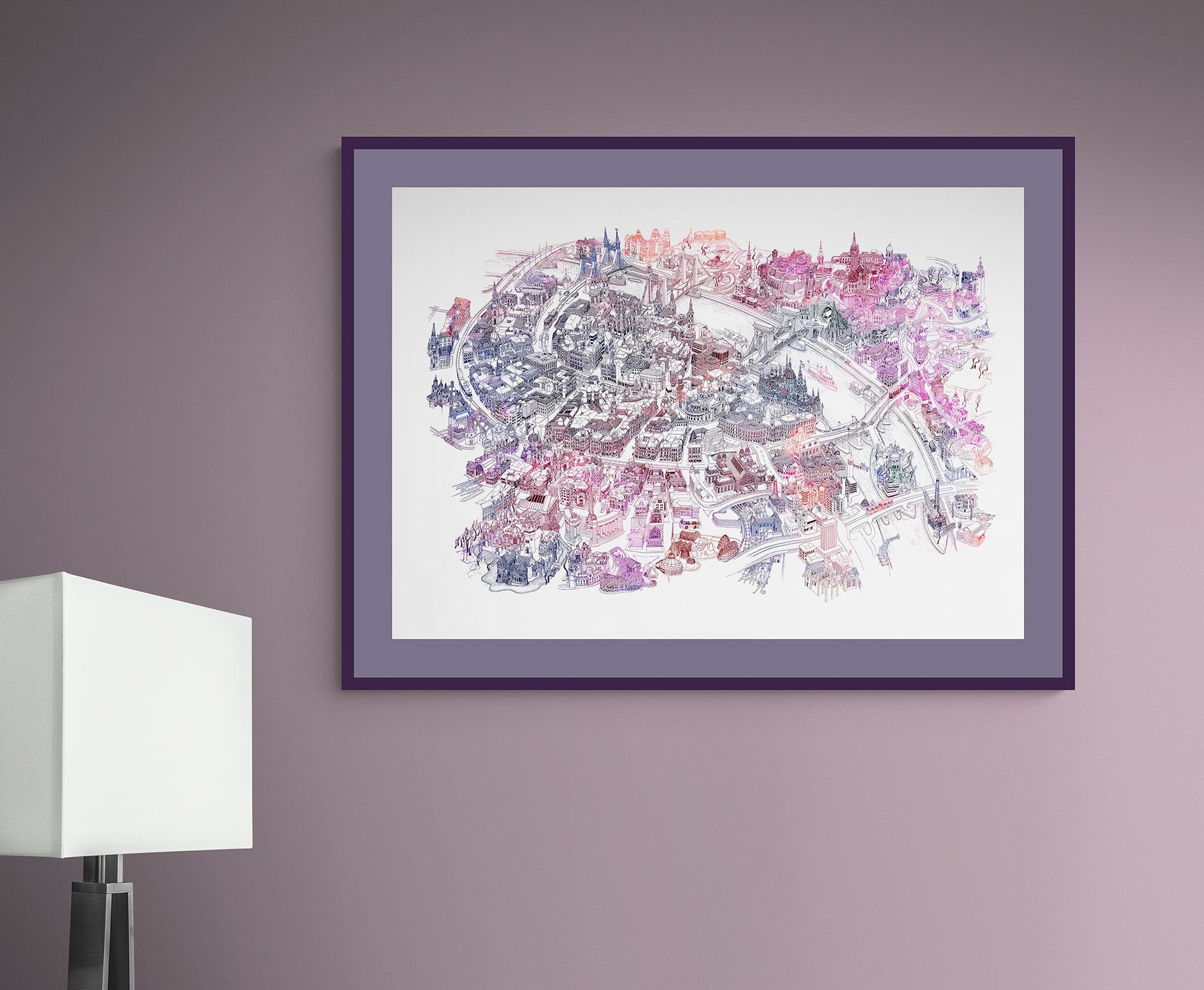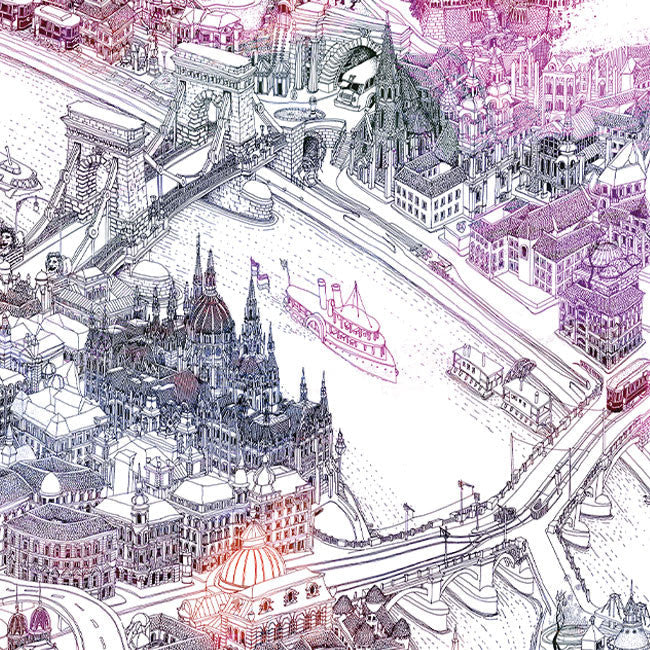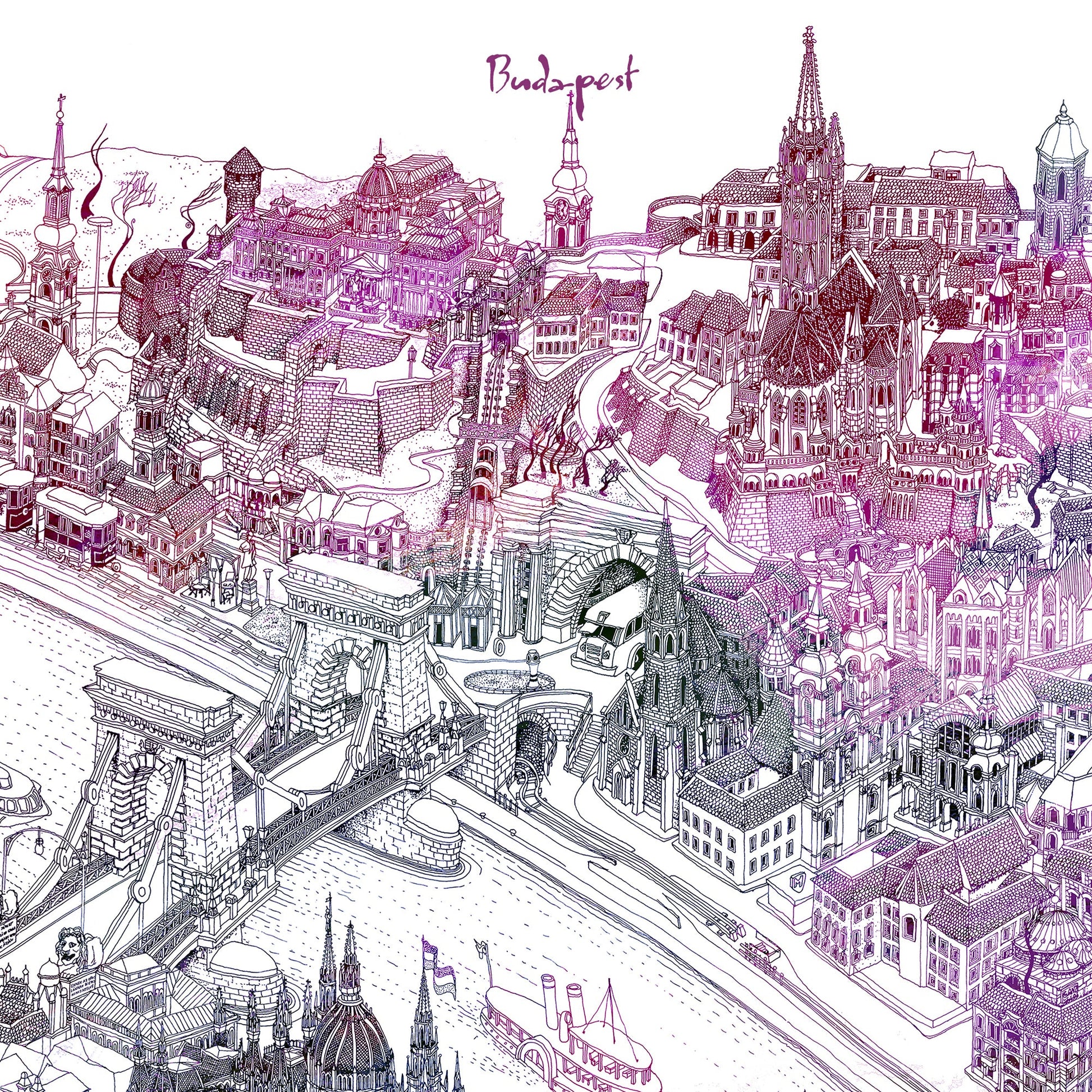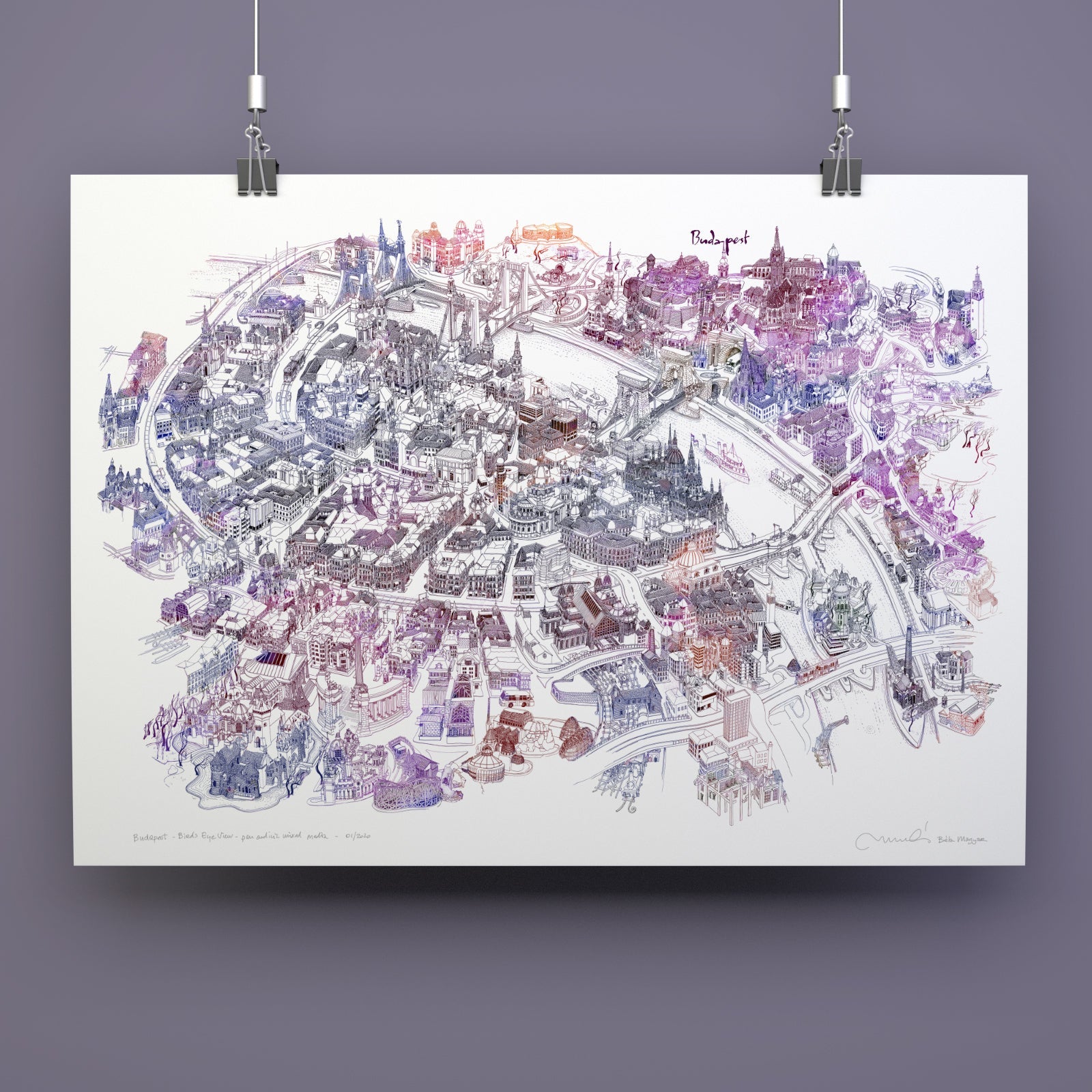 Very detailed freehand pen and ink Bird's Eye View Map of Budapest (Hungary). This perspective map presents the city in an unusual way: it was drawn with a single technical pen, a metropolis from my point of view.