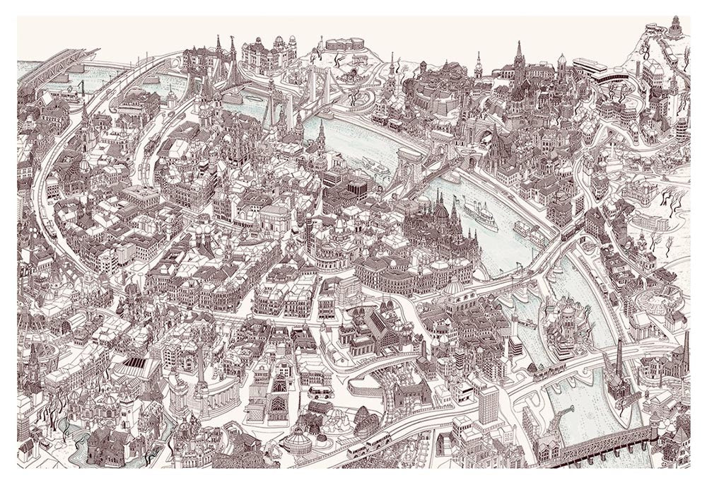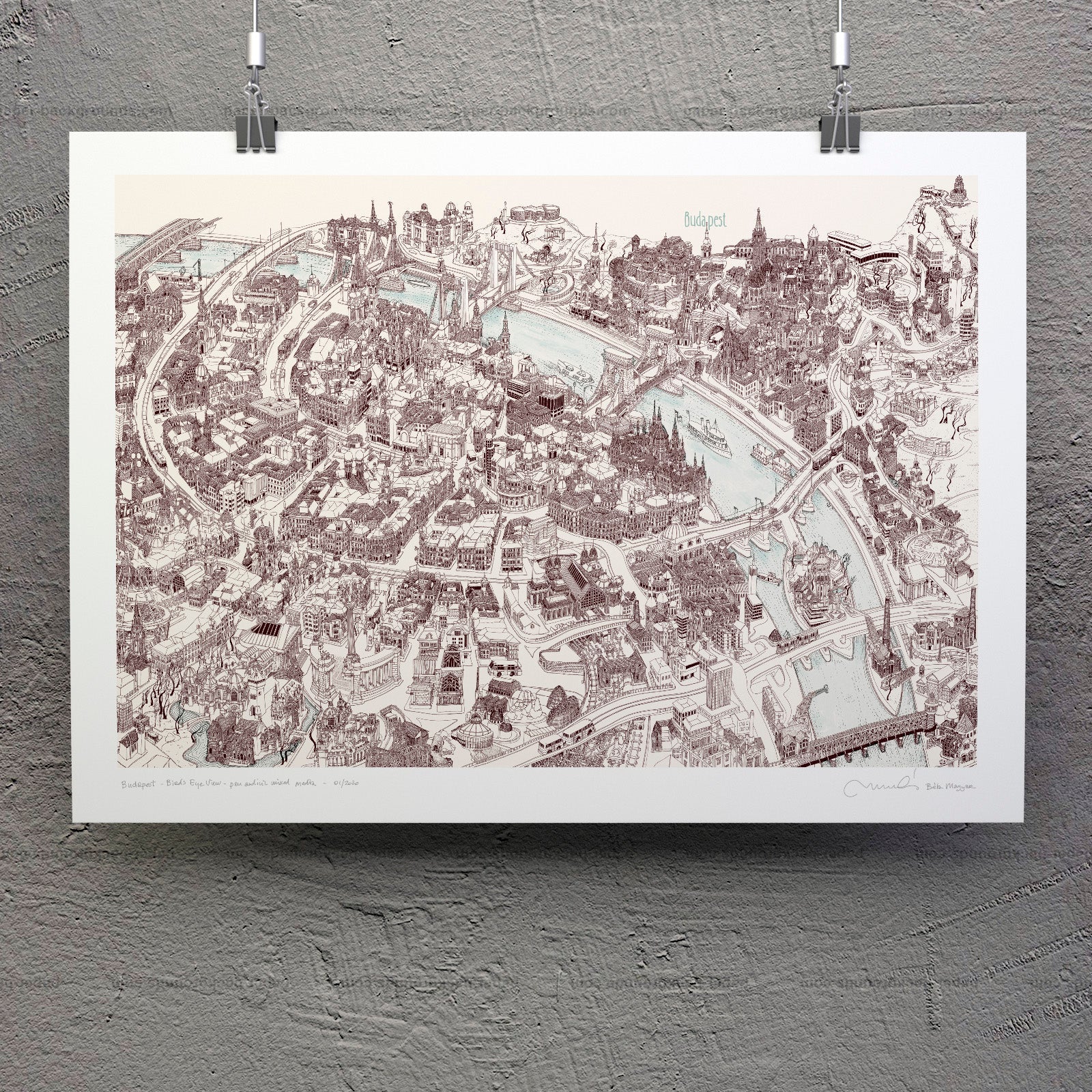 Very detailed freehand pen and ink Bird's Eye View Map of Budapest (Hungary). This perspective map presents the city in an unusual way: it was drawn with a single technical pen, a metropolis from my point of view.
