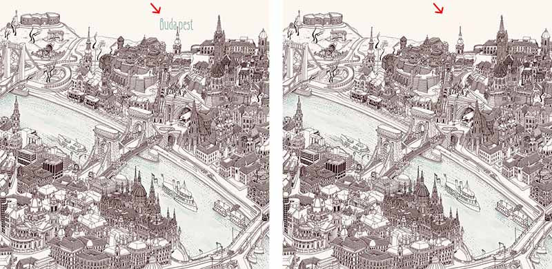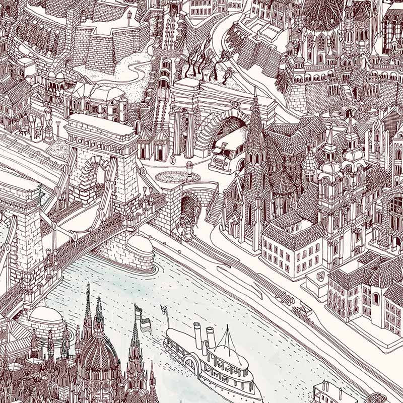 The Perspective Map of Budapest has many things for you to discover and to marvel about for hours, weeks, or even months. It draws up questions in the viewer, raises interest, and arouses the desire to check out all the actions depicted in the picture.