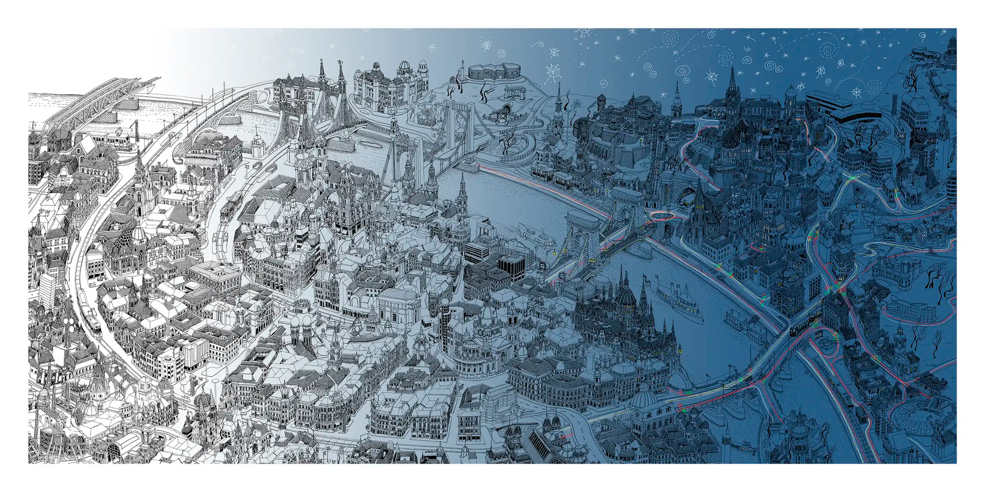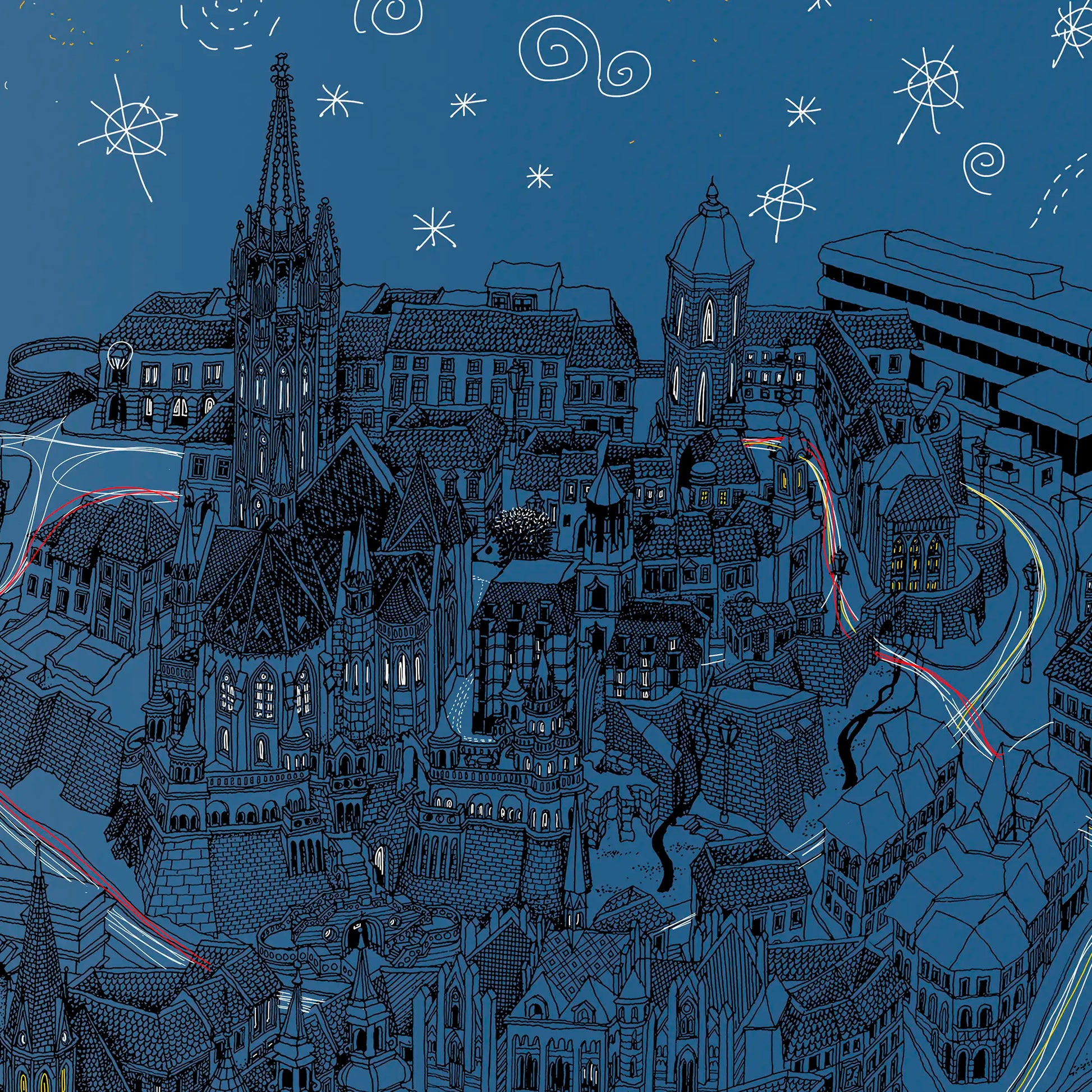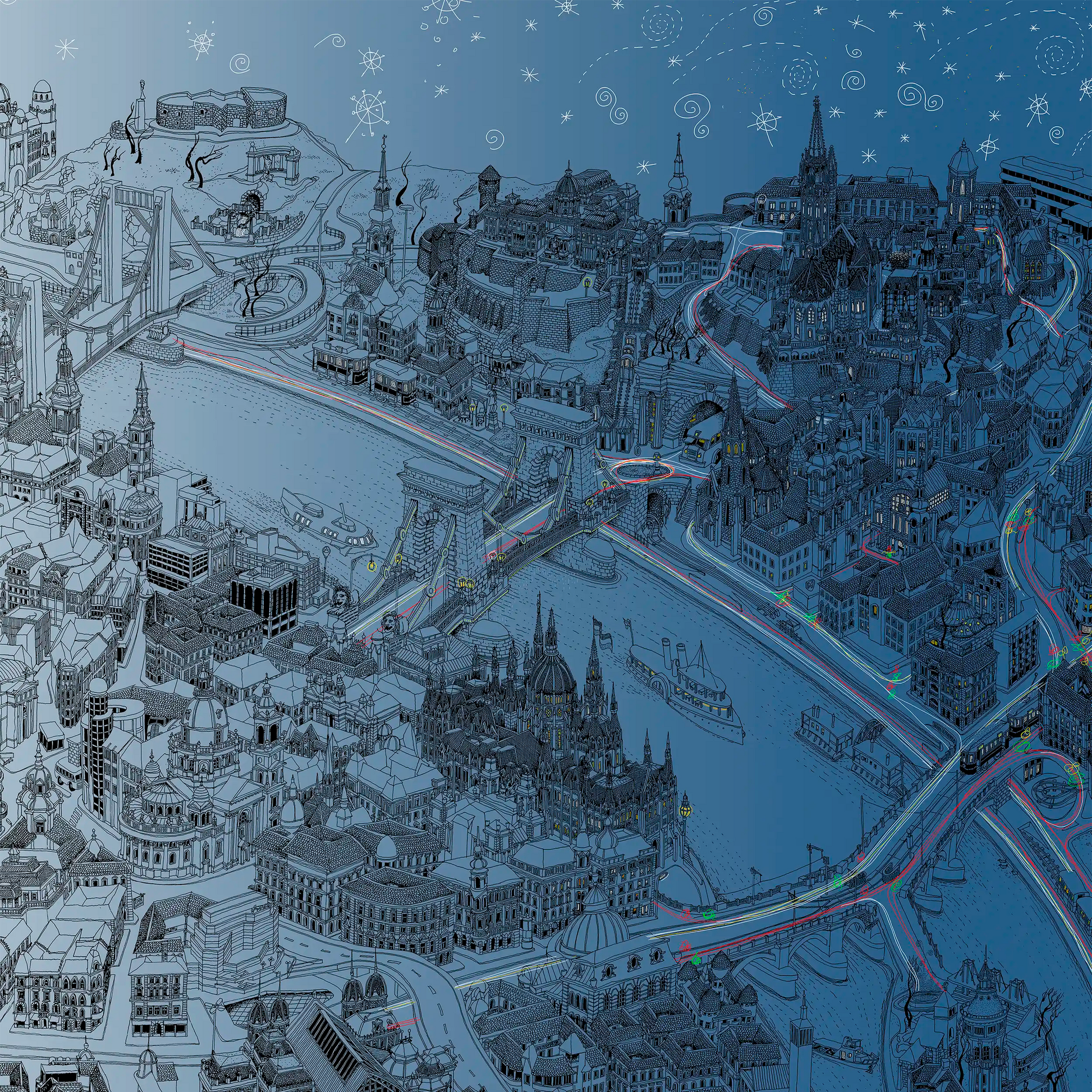 This illustration was inspired by images of Earth showing areas in daylight and others in darkness. I imagined Budapest as a city split between day and night—Buda already in the evening, while Pest is still bathed in sunlight. Traffic lights, car headlights, and the Chain Bridge are illuminated on the Buda side, with stars or snowflakes visible in the sky. The empty streets create a calm and quiet atmosphere, but warm lights shine from windows, hinting at life inside. This contrast between the vibrant energy of daylight and the peaceful stillness of night gives the artwork a unique, atmospheric quality.