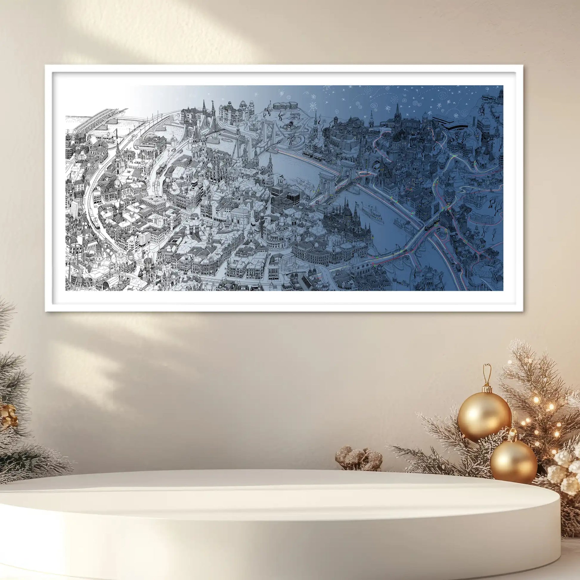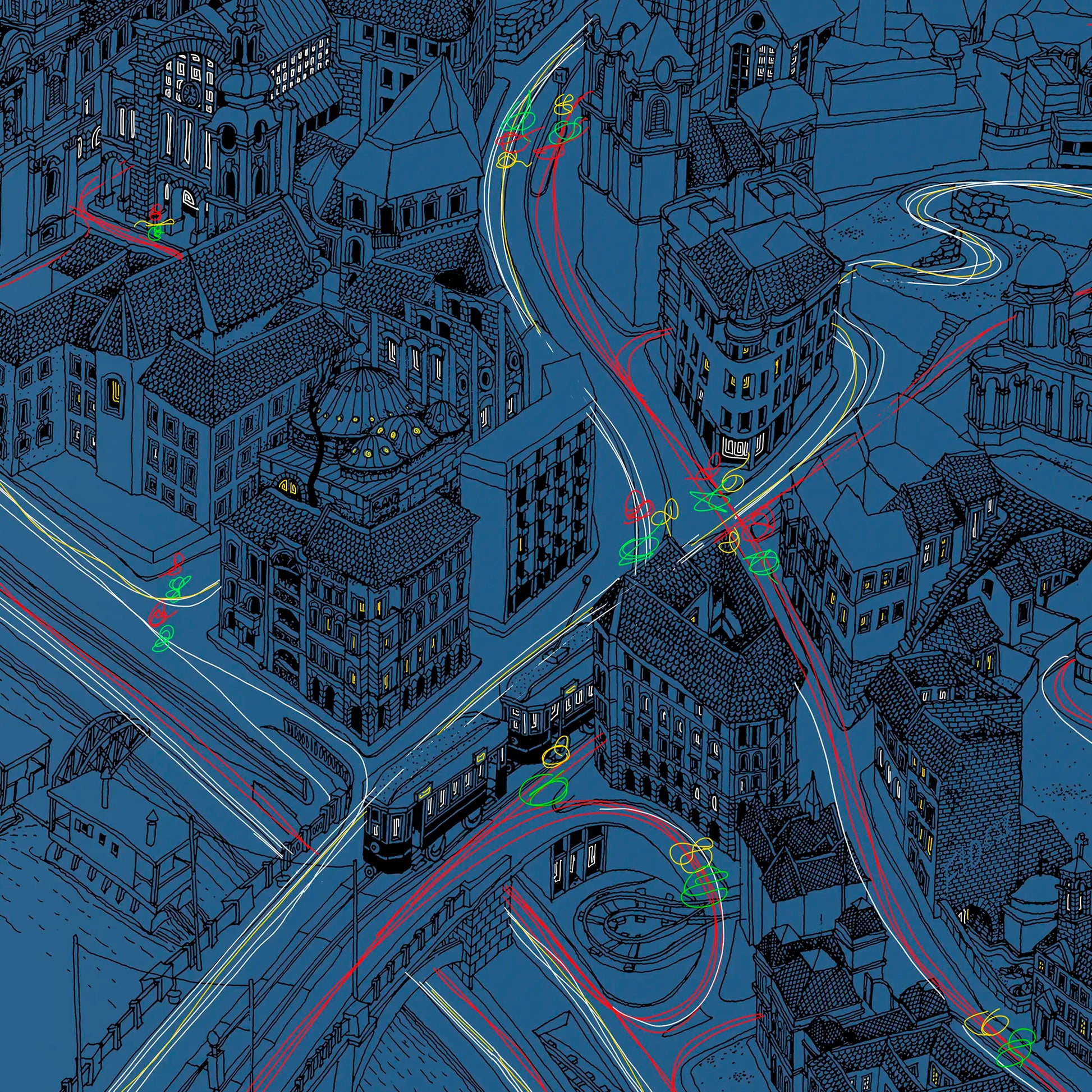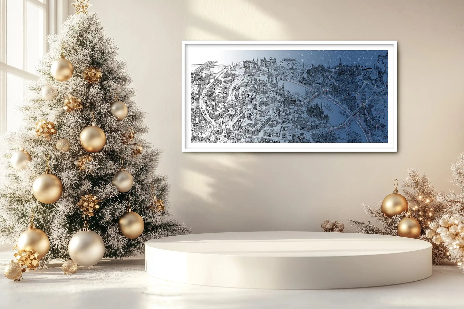 This illustration was inspired by images of Earth showing areas in daylight and others in darkness. I imagined Budapest as a city split between day and night—Buda already in the evening, while Pest is still bathed in sunlight. Traffic lights, car headlights, and the Chain Bridge are illuminated on the Buda side, with stars or snowflakes visible in the sky. The empty streets create a calm and quiet atmosphere, but warm lights shine from windows, hinting at life inside. This contrast between the vibrant energy of daylight and the peaceful stillness of night gives the artwork a unique, atmospheric quality.