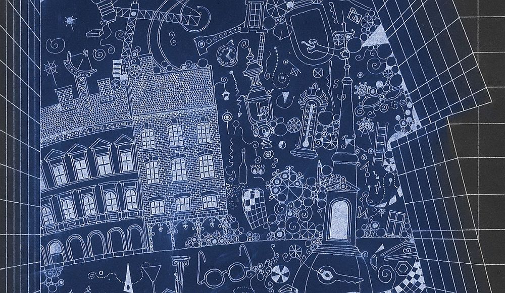View from a dark room to Budapest. The glowing elements of the cityscape float dreamily in the evening sky.