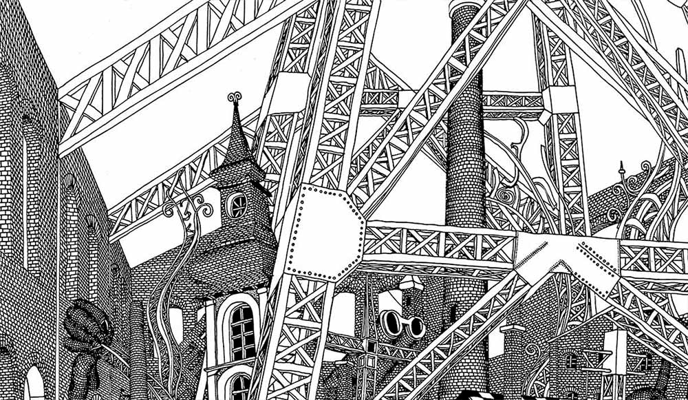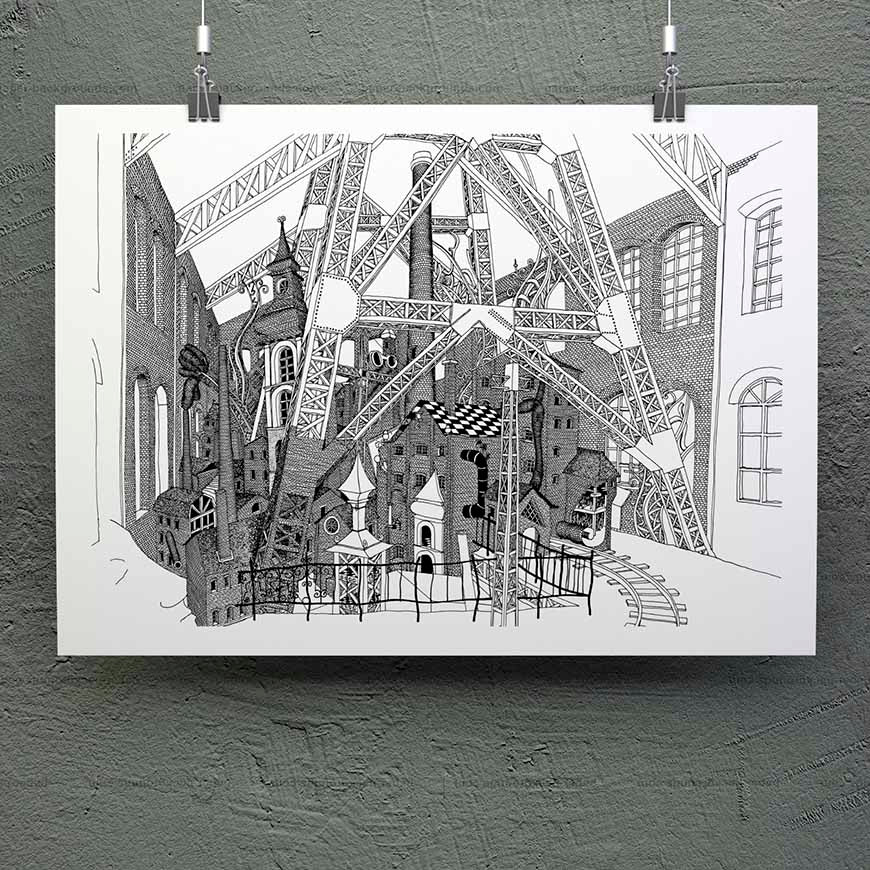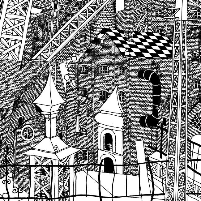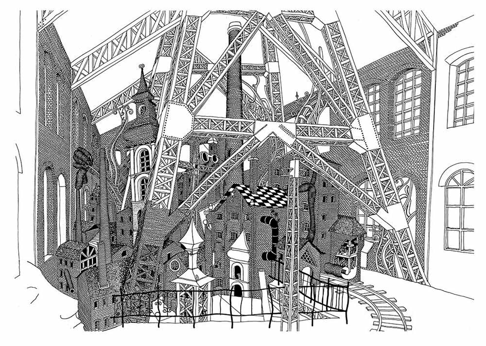 This drawing was inspired by the films (like Stalker, Solaris, and Mirror) of Andrei Tarkovsky, the Russian movie director. I was deeply impressed, affected by those crumbling industrial plants, forgotten, rusty steel-framed assembling halls, and the quiet, slowly flowing water everywhere.