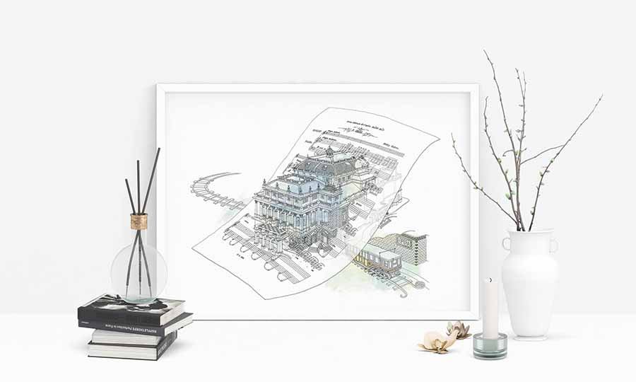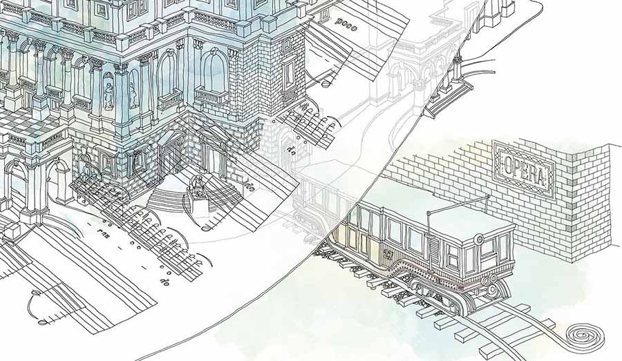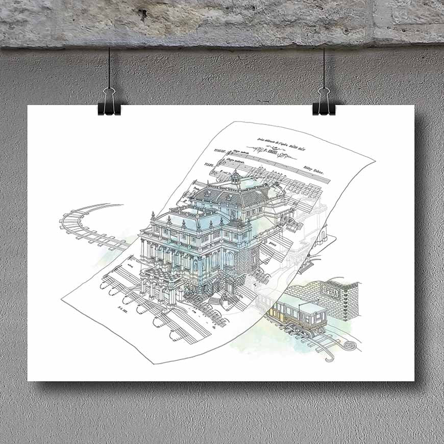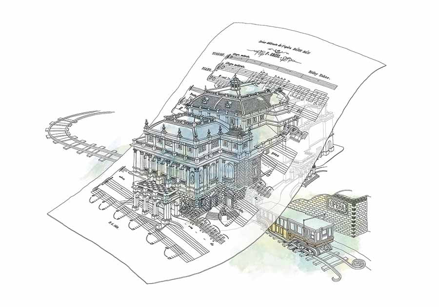 Budapest Opera House. with a page of a music sheet from a Hungarian Opera that was played in the opening ceremony at the end of the 19th century. Also seen is an old carriage of the subway line No1. which was the first subway line in the European continent.
