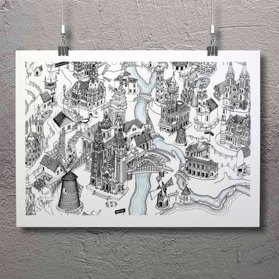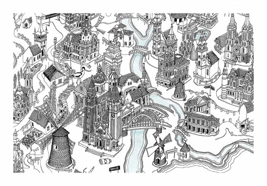 Very detailed freehand pen and ink 3D bird's eye view of Szeged, Hungary