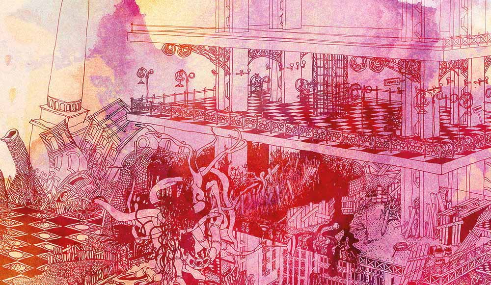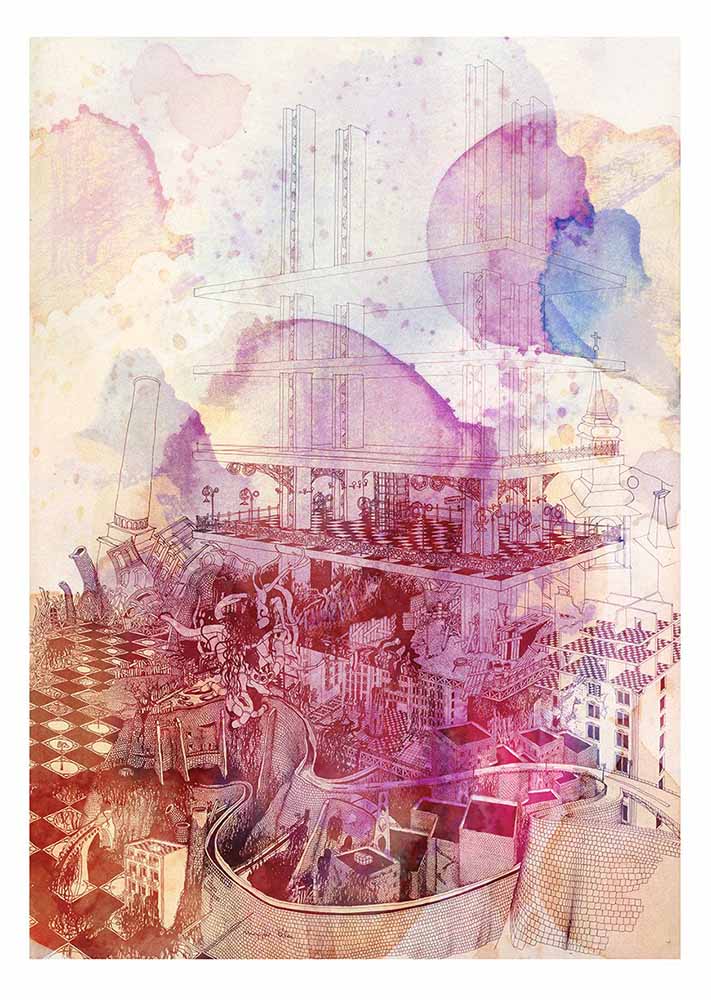 When Nature Strikes Back, when man abandons his built environment, nature strikes back. But what if... What if the rusty steel constructions, the crumbling brick walls, the endless pipelines keep their end up and strike back and organic, surrealistic, and unsustainable development of the built environment and nature has begun.