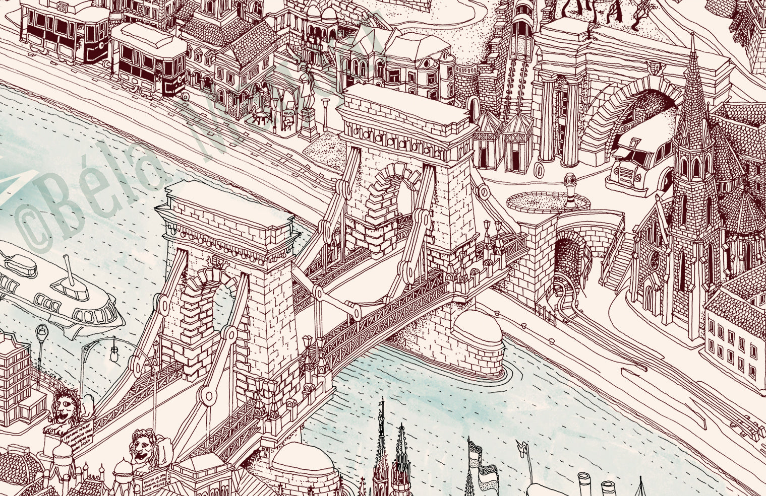 1989 – Bird’s eye view maps. Starting with Budapest, the lush, surreal dreams have been replaced by bird’s eye view cityscapes of actual cities - looking like illustrations of children’s stories. Budapest, Hungary, Szentendre – these large (the original of Budapest is more than 2 meters in length) illustrations are map-like cityscapes, but not accurate maps. They represent the essence, the summary of the city, bird’s eye view through the eyes of the artist. Being an architect, Béla constructed the buildings and bridges rather than simply sketched them. The buildings stand as firmly as the actual buildings because he knows what happens under the roof of the houses.