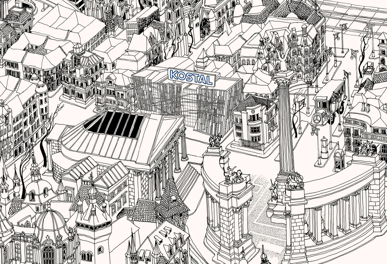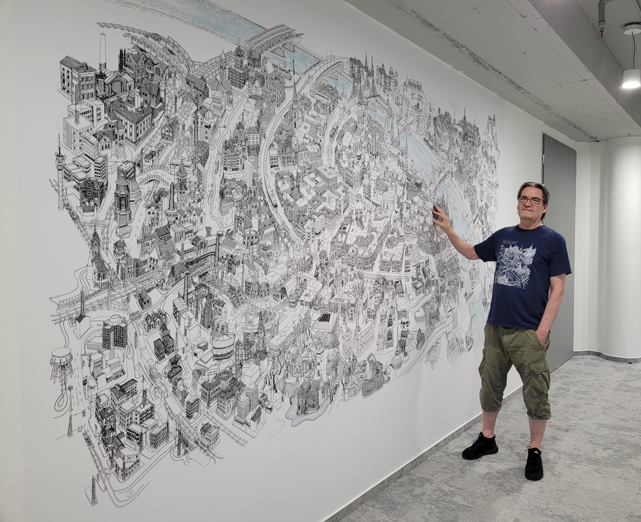 A custom design of the Budapest cityscape was created and printed on high-quality wallpaper to cover a 5-meter-long wall in the Kostal office on Dózsa György Street.