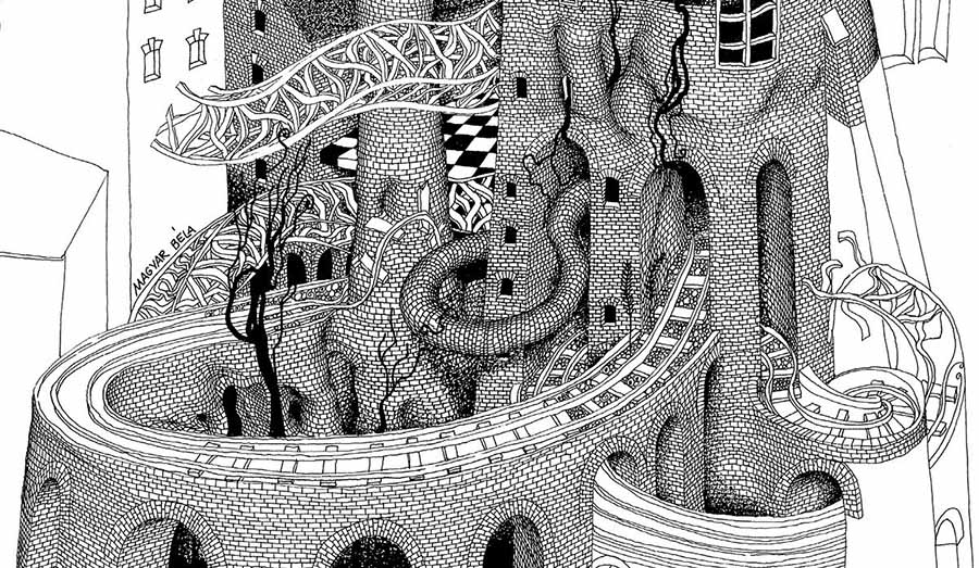 Organic, surrealistic, and unsustainable development of the built environment and nature, a surreal fun park.